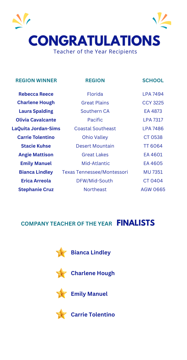 Among our 12 region winners are 4 finalists for Company Teacher of the Year. The winner of this prestigious award will be shared in October.